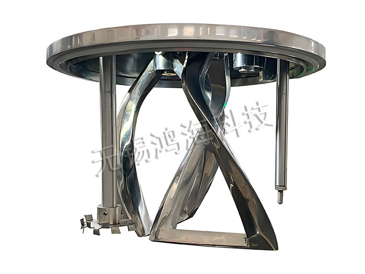 在行星架上有一刮壁刀隨行星架轉(zhuǎn)動,緊貼桶壁不斷的刮拭,桶壁經(jīng)大型立車精加工后,再經(jīng)大型自動拋光機(jī)拋光,確保行星架上的活動刮刀在旋轉(zhuǎn)時把桶壁的物料完全刮掉,使桶壁無滯留料,提高混合效果。